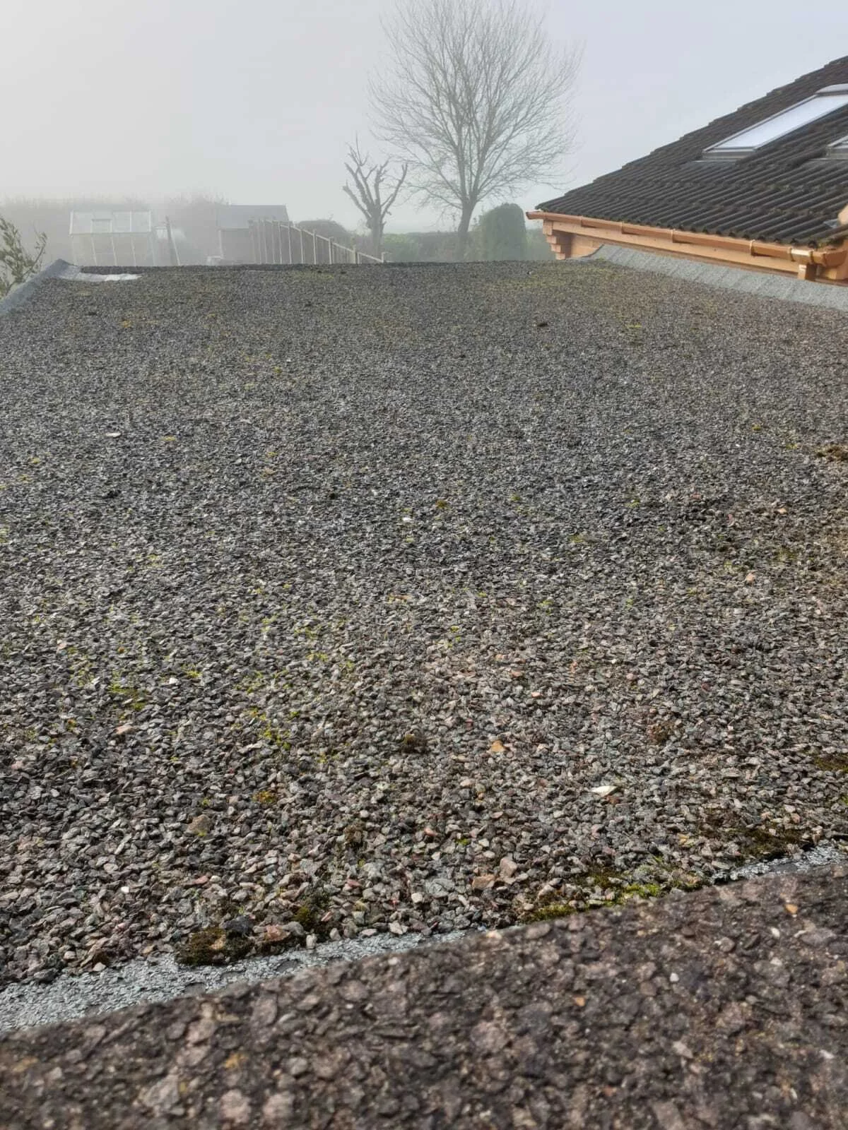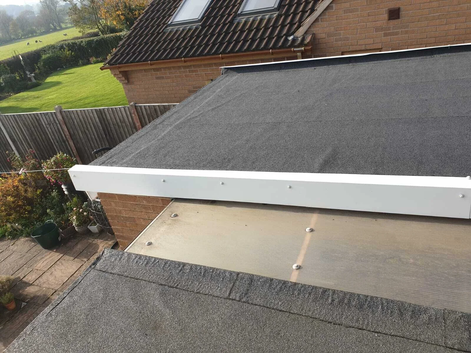 We stripped the existing felt roof down to the tongue and groove timber. Refelt with 2ml torch on 1 layer to all areas and upstands, then cover in 4.5ml torch on mineral finish in grey.